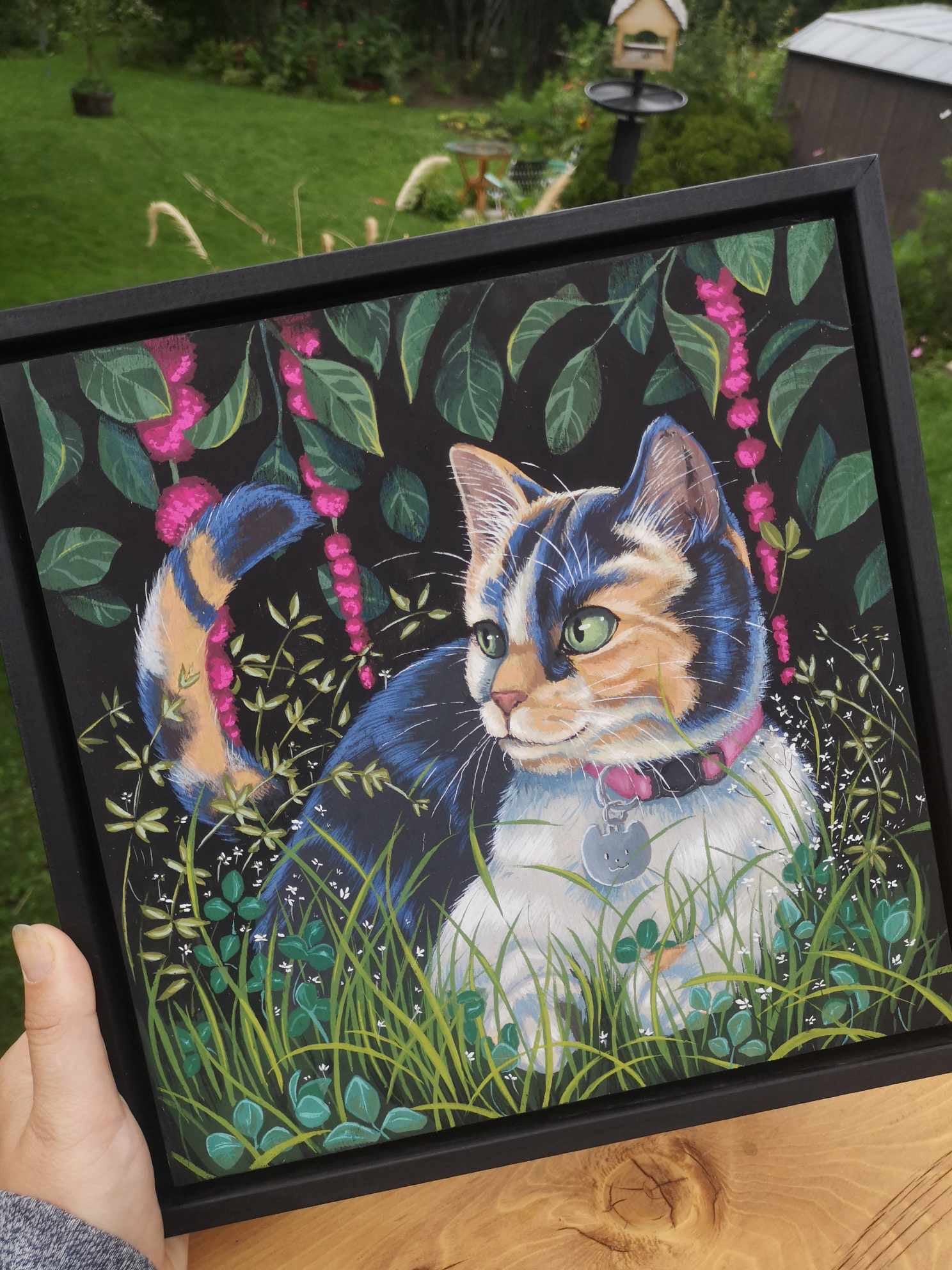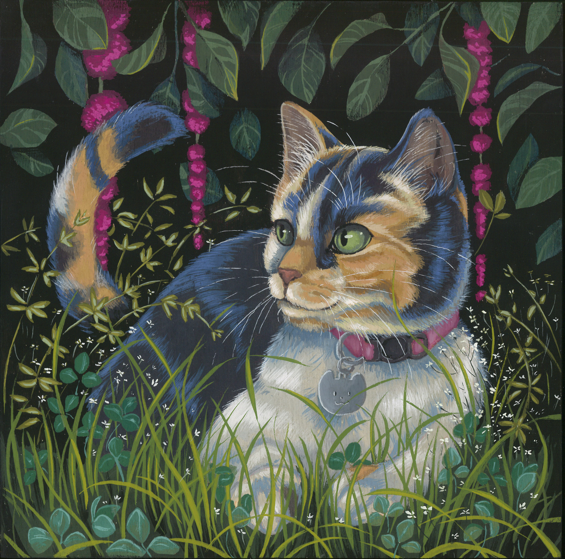 This piece is an original painting and depicts a lovely diluted calico kitten hiding in an array of garden plants. Her body lays slightly obscured by the grass and vegetation as she curiously prowls in a garden of amaranth flowers. The painting highlights the striking color palette of the calico kitten against the vivid amaranth backdrop of the garden. Its subtle blend of realism and stylized technique creates an inviting and captivating atmosphere.