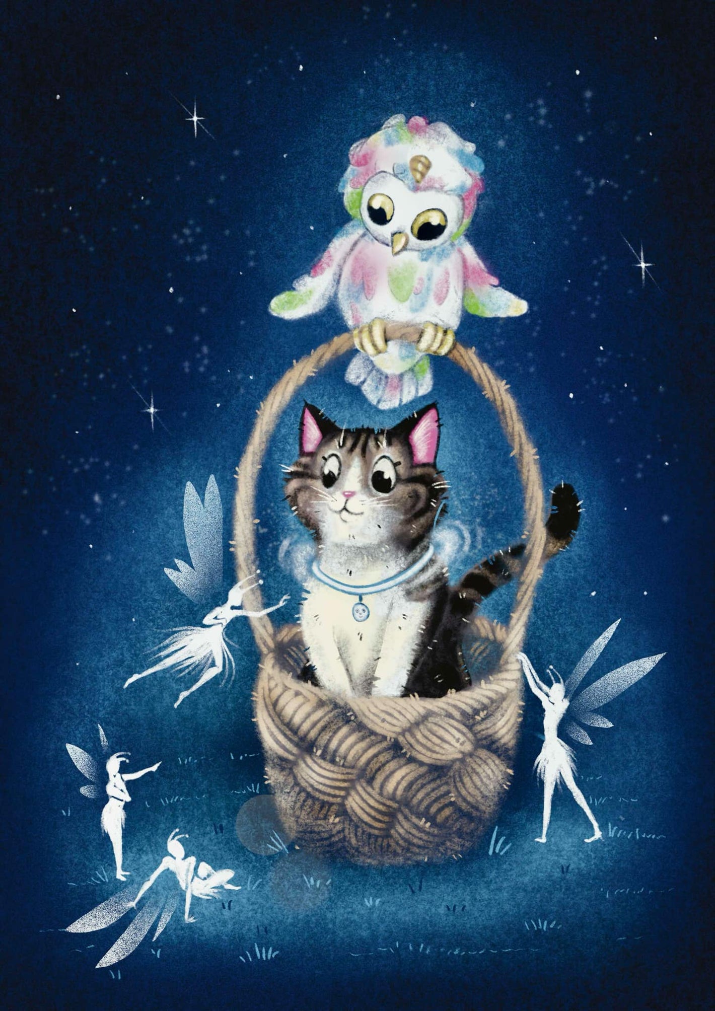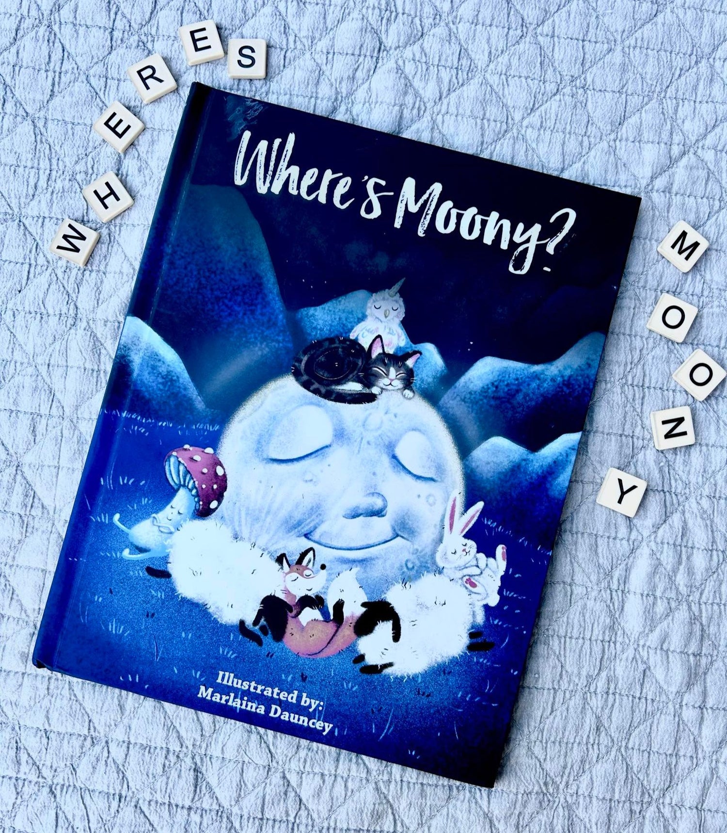 Canadian Illustrator, Marlaina Dauncey 's first children's book "Where's Moony" features the charming tale of Kat, and Owlie as they set off on a thrilling adventure to find Moony, who has disappeared from the sky after a frightening storm swept over their home in the hills of Ireland.