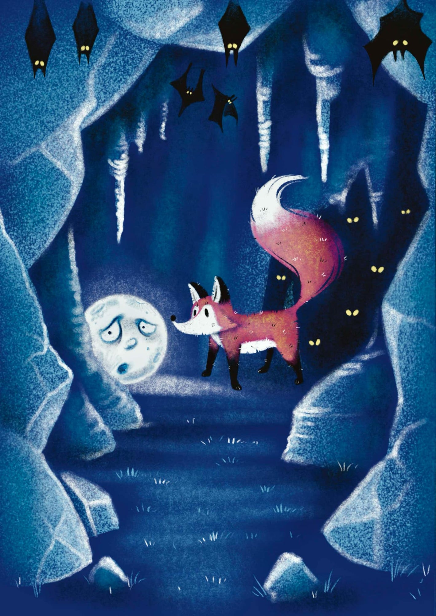 Moony, afraid, shrinks down small to hide in a cave. A fox friend finds them and gives Moony courage.